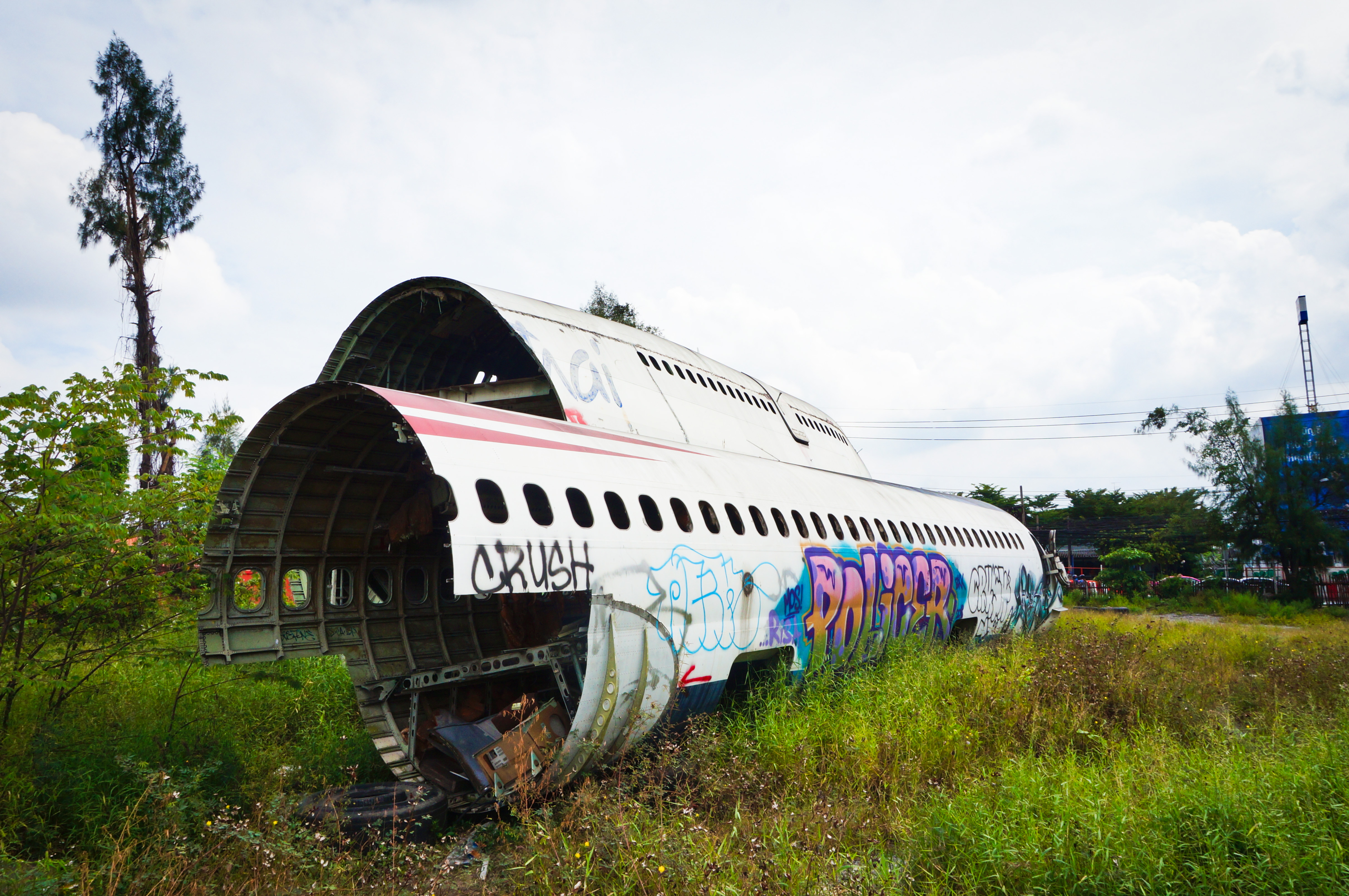 On the outskirts of Bangkok there is a field. Well, probably there are many fields. But this particular field is home to the ruins of several abandoned airplanes. Called the Airplane Graveyard, it sits near Wat Sriboonruang and contains the remains of three airplanes – a 747 and two MD-82 jetliners – plus some other random plane pieces.
